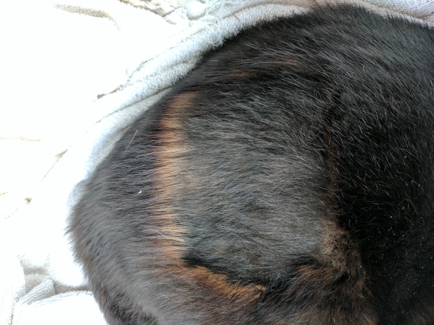 Midnight is fine. He doesn't have rabies (obviously, or I would have posted an update when we found out that he did, lots of drama ensuing, yada yada yada). His stitches and the drains came out right on time; he was healing beautifully. He has since then healed fully, and no more fluid has filled the (former) abscess site, so it appears we were entirely successful in draining it, yay! His fur is slowly growing out, so now it simply looks like he has a weirdly colored brown square in his fur instead of a weird grey square edged in brown. Here, have a look: